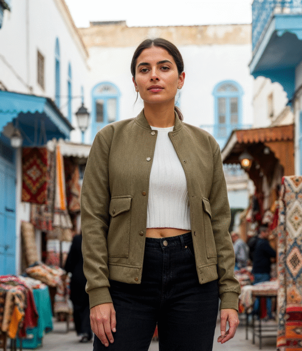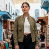 Veste bomber jacket confectionnée en filature avec laine cachemire synthétique.